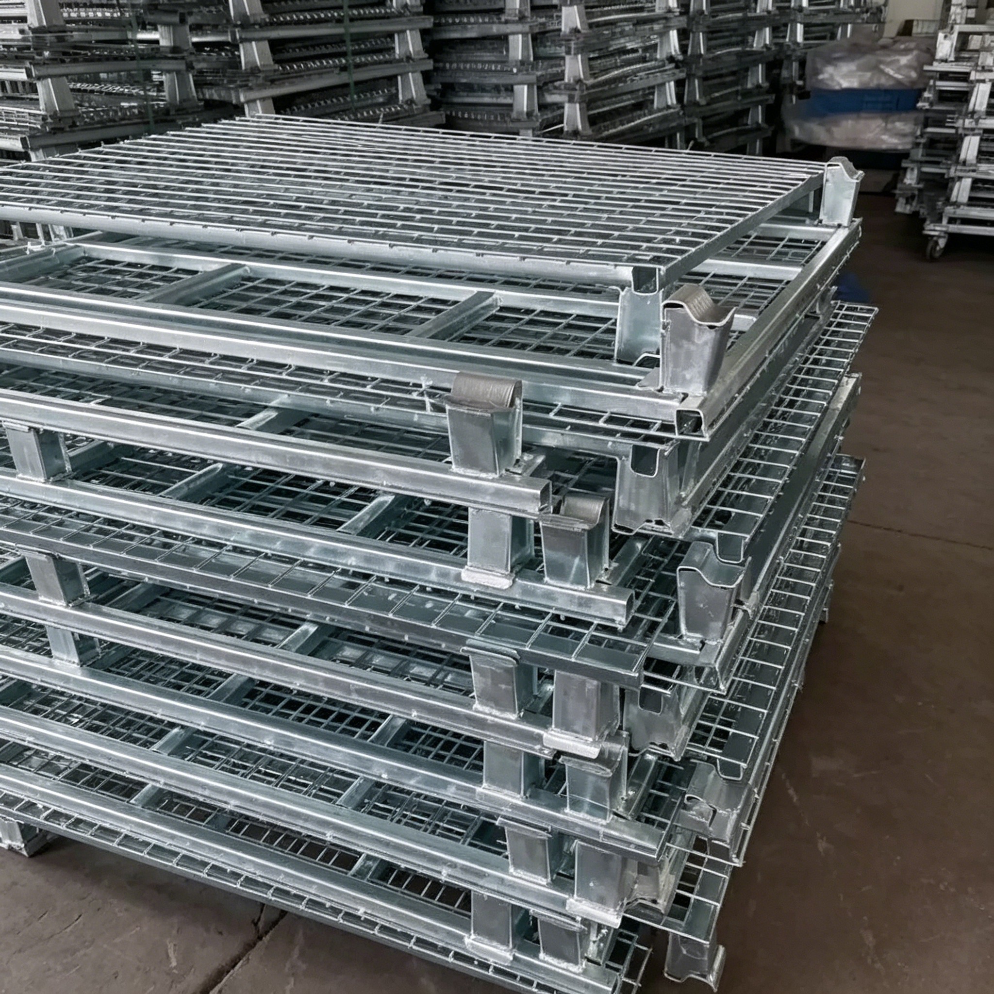 • بهرهوری فضا: از روی هم چیدن پایدار 4-5 لایه در هنگام بارگیری کامل پشتیبانی میکند؛ چیدمان انبار سهبعدی ظرفیت مؤثر انبار را بیش از 30% افزایش میدهد. طراحی تاشو حجم بیکار را تا 70% کاهش میدهد و در هنگام عدم استفاده از قفسهها، صرفهجویی در فضای انبار را به حداکثر میرساند.